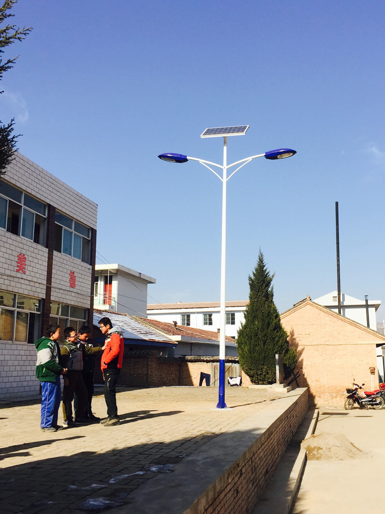 簡介—— 甘肅省平涼市學校路燈工程,采購的是我蘭光照明單板雙頭太陽能路燈,甘肅的冬季天黑的比較早,為了給校園操場提供照明路燈,安裝節能型的太陽能路燈,在學校的操場和道路上安裝,給同學們提供夜間照明。